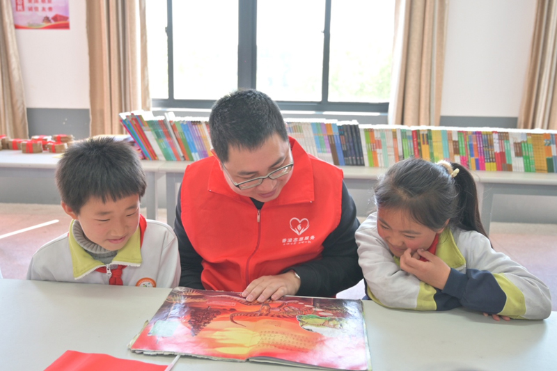 “香溢”志愿者與孩子們一起閱讀圖書。王喆攝