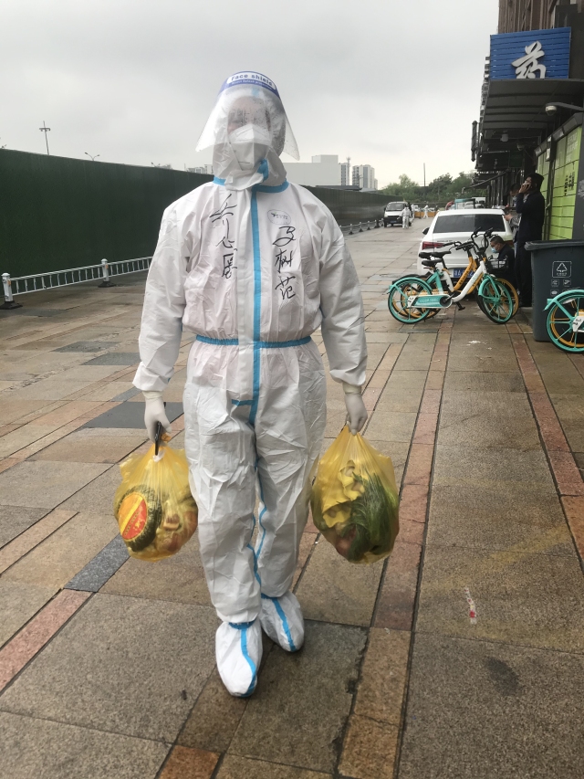 “服務‘疫’線居民,老馬和其他志愿者真的不容易!边B城社區工作人員告訴記者,封控區有262戶居民,每戶都能分發到一份政府物資大禮包,其中包括蔬菜、大米、肉禽蛋、油等,總重量在30斤左右,需要志愿者們挨家挨戶配送。