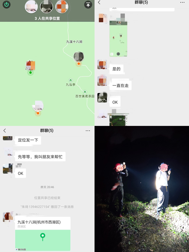 南山派出所救援民警與杭州西湖區龍井村村委會取得聯系,了解山體地理環境,得知求助者定位顯示的白洋塢無正?尚械牡缆,且山域較大、搜尋困難,下山最近的地點為九泓亭,救援警力隨即引導求助者按照群共享信息,沿著溪溝向山下行走。