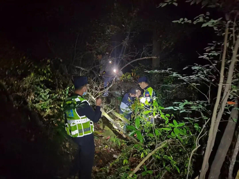 救援民警到達現場并確認大致位置后,通過喇叭喊話、燈光照射等方式進一步確認位置,但求助者只能微弱地聽到民警們的聲音,無法看到燈光。于是,大家通過喊話的方式,一面對走失的游客進行安撫,一面朝著他們的方向緩慢前進。