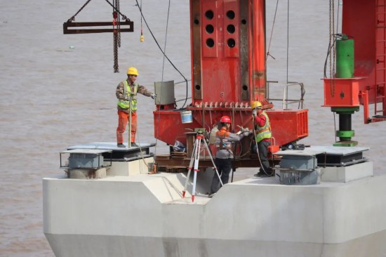 來到濱海高架特大橋的施工現場,技術員們正在進行梁片架設前的水平校準工作。每次架梁前,他們總是要扛著測量設備,通過架橋機安全通道,提前守候在9米高的海域墩柱上,通過校準、校準、再校準,確保能夠將1800噸重的梁板精準地放置在墩柱上!盀I海高架橋地處海域,施工難度大、技術難題多。我們通過采用‘越海號’架橋機以及梁上運梁的方式,成功實現預制箱梁的架設任務,目前50米主線整孔箱梁架設任務已經完成過半!焙拣畯途寧波一期指揮部副指揮翁奇波介紹。
