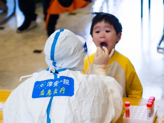 “小妹妹把嘴巴張開!5月13日早上7點多,在桐廬城南街道東興村核酸檢測采樣點,來自淳安縣中醫院的醫護人員陳昕正溫柔地幫一位小朋友做核酸采樣!巴⿵]百姓都很積極配合,這樣也加快了我們的工作速度!彼χf。