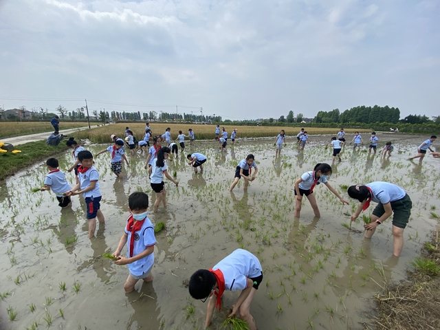 站在田埂上,孩子們爭先恐后地脫下鞋襪,一下田,就體會到了插秧不是簡單活,在水田中站穩都不容易!坝檬持负椭兄搞Q住秧苗的根部,掌心朝向秧苗,食指和中指順著秧苗的根朝下秧苗和秧苗之間的間距大約是兩拳寬,要保持秧苗的豎立!爆F場,老師們一邊保護學生安全,一邊給同學們示范。孩子們躍躍欲試,在老師仔細指導下,把秧苗小心翼翼地插進田里。