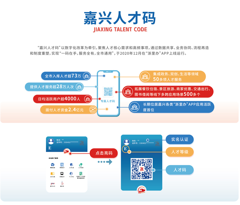 目前,“嘉興人才碼”集成政務、雙創和生活等領域50多項人才服務,拓展線下應用場景500多個,基本實現“一碼在手、服務全有、全市通用”,入庫人才已超73萬人,日均活躍用戶數超4000人。