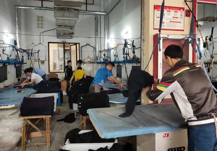 走進中心,“呲呲呲”的聲音不絕于耳。各間鋪面里,蒸汽熨斗在操作工手中上下“翻飛”,桌案上的羊毛衫被熨燙得筆挺。