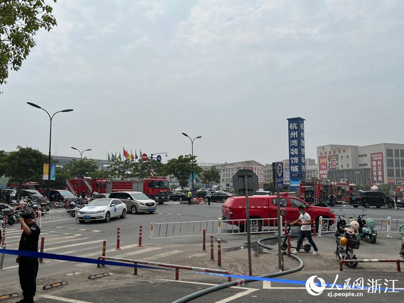 人民網浙江頻道趕往現場后看到,空氣中仍有灰色煙霧彌漫,隔著口罩仍能聞到刺激性氣味,火災發生附近樓宇有被濃煙熏黑的痕跡。在北沙西路,二三十輛消防車正在進行救援,消防人員表示,火災產生了有毒氣體,F場已拉起警戒線,道路兩旁,社區警察正在疏散周圍群眾、維持現場秩序。