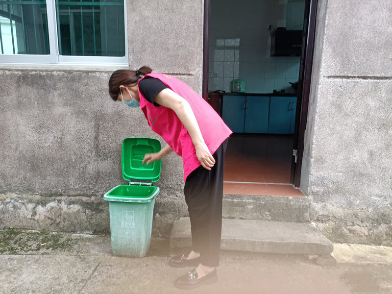 寧?h長街鎮伍山村文化禮堂管理員正在查看各戶垃圾分類情況