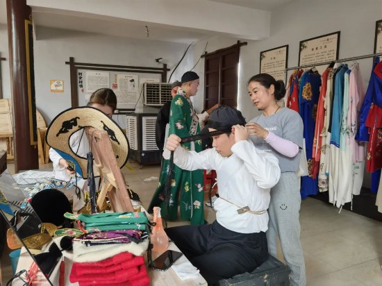 近日,在永嘉南城街道前二村文化禮堂的臨時化妝間里,永嘉昆劇團的演員們正忙著化妝、戴頭面、更換戲服,做好演出前的準備工作。