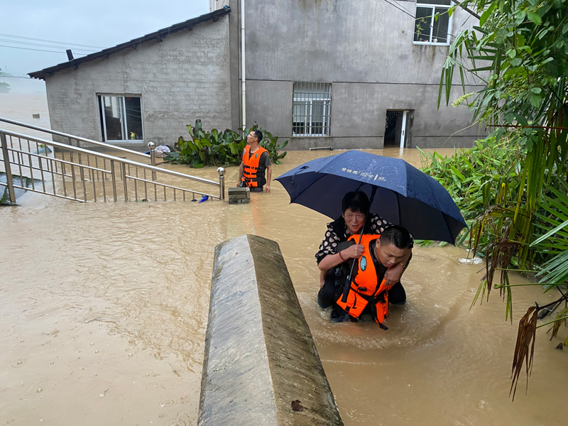 受暴雨影響,6月20日早上6點左右,開化縣音坑鄉下於村有兩人被困二樓。衢州消防部門接警后,立即指令鳳凰中路消防救援站出動2車10人趕赴處置。到場后,消防員發現現場水位最深處達2米多,遂利用沖鋒舟前往被困人員位置,為他們穿戴好防護裝備,隨后成功轉移至安全地帶。