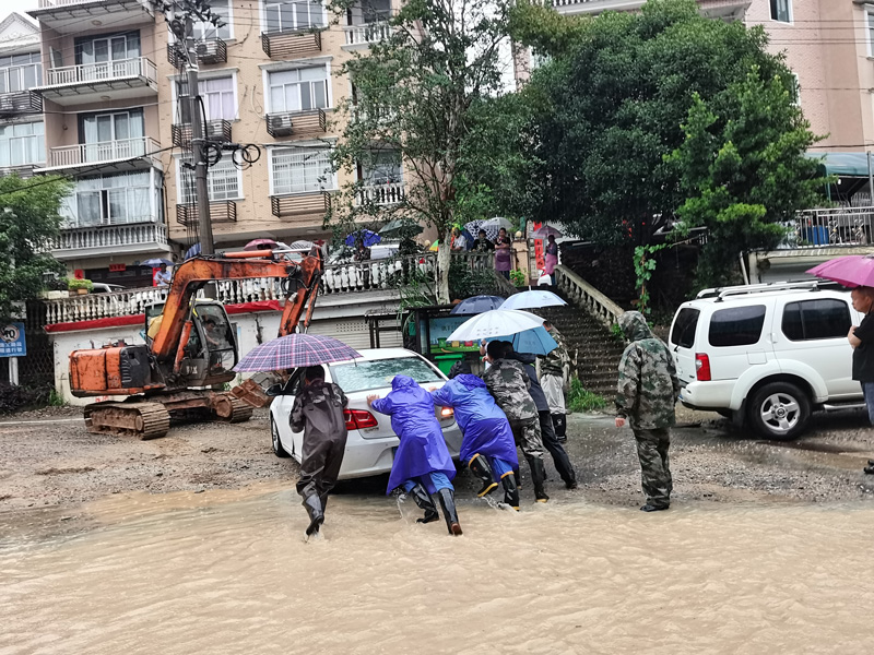 龍泉市塔石街道振興路路面積水嚴重,街道干群合力開展救援。龍泉市委宣傳部供圖