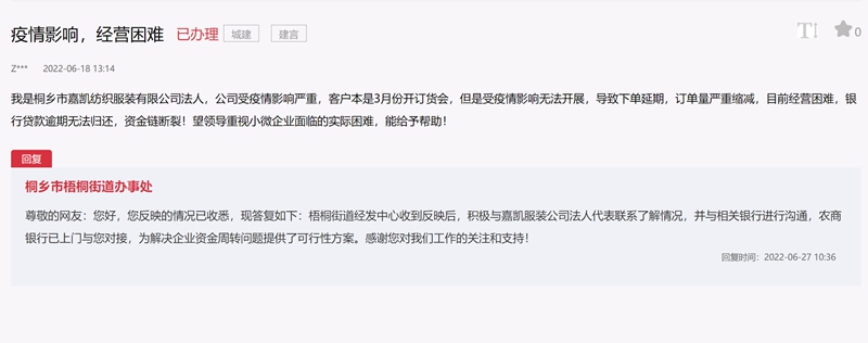 接到求助留言后,桐鄉市梧桐街道經濟發展中心工作人員聯系到朱先生,在核實情況后與相關銀行進行了溝通,“我們主要是幫助其順暢對接,通過銀行的金融服務來緩解企業經營壓力。”據了解,目前,浙江桐鄉農村商業銀行股份有限公司屠甸支行已去到企業與朱先生進行對接,為解決企業資金周轉問題提供了可行性方案。