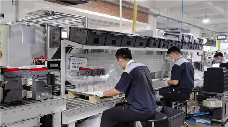 上海良信生產車間,工人正抓緊生產斷路器配電產品。良信供圖