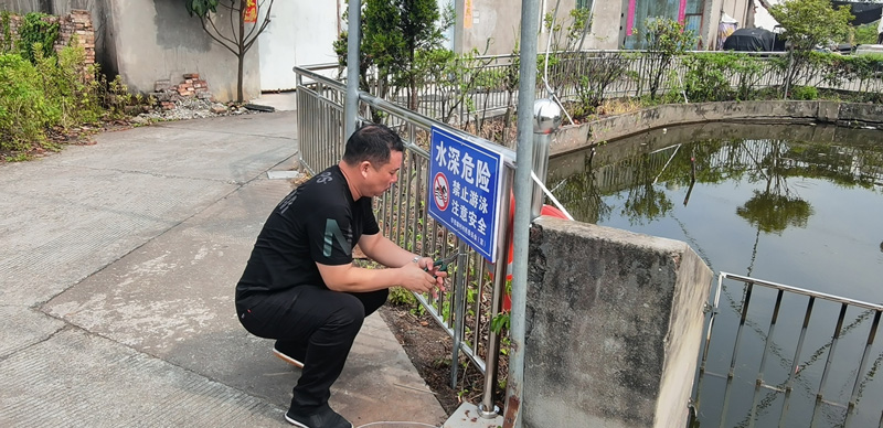 李蓍埭村黨總支書記、村委會主任梁云青加固防溺水警示牌。峰江街道供圖