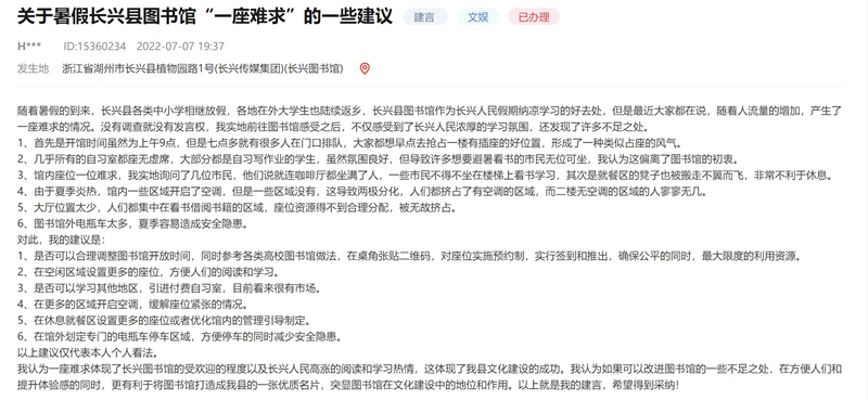 該網友表示,“一座難求”體現了長興縣圖書館的受歡迎程度以及長興人民高漲的閱讀和學習熱情,體現了長興縣文化建設的成功,如果可以改進圖書館的一些不足之處,在方便人們和提升體驗感的同時,將更有利于將圖書館打造成長興縣的一張優質名片,凸顯圖書館在文化建設中的地位和作用。