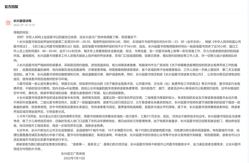 這位網友的留言,引起了長興縣文廣旅體局的高度重視。圍繞建議內容,相關單位進行了深度調查研討,在回復中表達了對網友關注長興縣文化建設發展并提出寶貴建議的感謝,并表示“讀者第一,服務至上”是其辦館的宗旨。