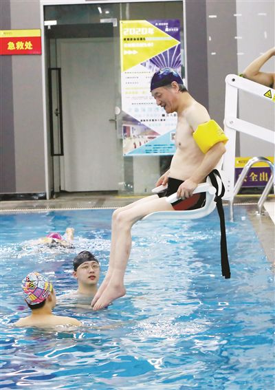 這是他第三次來到這個游泳館游泳。記者在現場看到,胡雄華換好泳衣后,工作人員用輪椅通過無障礙坡道將他推進游泳區,再通過升降機,他就能下水了。