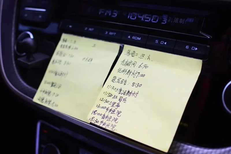 陳志飛駕駛的出租車方向盤邊上貼著兩張便簽紙,一張記錄著每周一、周三、周五固定要去接送的特殊乘客的時間、地點,還有一張記錄著每周二、周四、周六要去接送的特殊乘客的時間、地點,大部分是老年乘客往返市區各大醫院的服務內容。這些都是陳志飛在95128愛心車隊平臺上接到的單子。