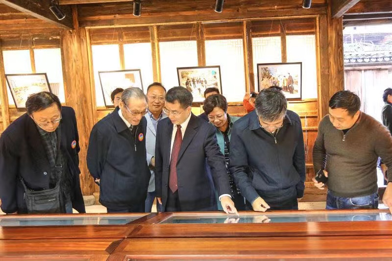 北大教授、考古界泰斗嚴文明(左二)參觀三江樓館藏資料。三江樓供圖