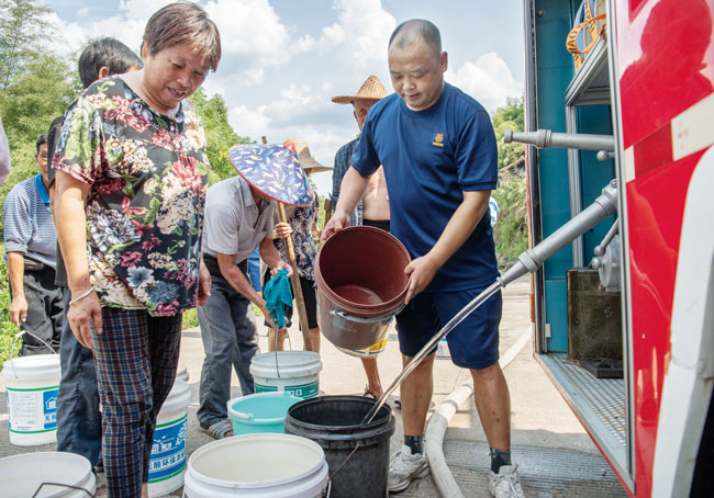 8月15日,金華市武義縣柳城畬族鎮民間消防隊的消防車開到坦洪鄉章坑自然村,給山村村民送來4噸清水。受持續高溫天氣影響,武義縣部分山區農村出現飲用水源干枯。該縣防汛抗旱指揮部第一時間啟動應急預案,組織消防車、灑水車給山村送水。截至目前,共為山區村民送水約67噸。(時寬兵)