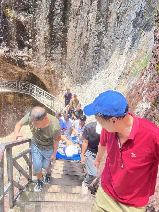 現場,衛生院醫護人員與景區安巡員檢查了患者的發病情況并做了緊急處理,民警對其進行了情緒安撫,之后將患者緩慢轉移到擔架上。在抬運過程中,由于棧道窄且坡陡,為減輕患者不適,救援人員輪番上陣,經過2個多小時不間斷抬運,終于將患者抬到景區出口,再由120急救車輛和醫護人員送至度假酒店。