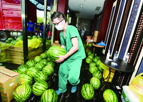 “謝謝你們,我已經十幾天沒回過家了,還真有點想吃新鮮西瓜?!?月20日下午,金華義烏市20余名志愿者采購了14500余斤新鮮西瓜,來到義烏市中心醫院、復元醫院醫務人員的休息處,送給700余名醫務人員。為減少人員聚集,志愿者將大部分西瓜放置陰涼處,由醫務人員自行前往領取?!扒皫滋?,看到有些做核酸采樣的醫務人員中暑,我們就給他們采購了1000件‘冰馬甲’?!敝驹刚呓M織負責人說,此輪疫情期間,醫務人員確實非常辛苦,他們希望通過慰問表達感激之情。(錢旭升)