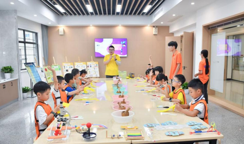 在二層,孩子們正和老師一起做餅干、用望遠鏡觀察物體。小朋友何雨琦說:“今天我給老師做了賀卡,還看了洋蔥的表皮細胞,覺得挺有趣的。我跟其他小朋友們相處得很開心,學到了很多的知識?!?/p>