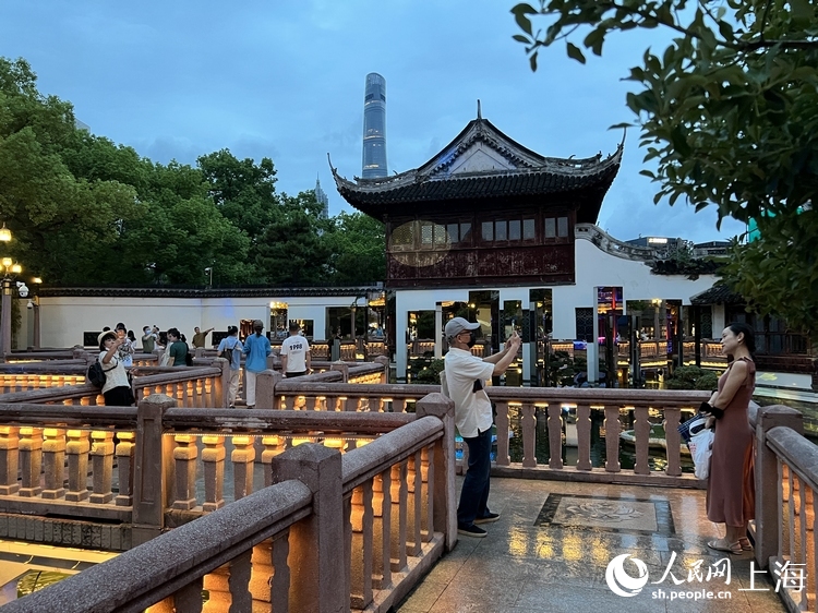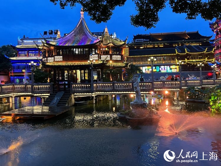 夜幕降臨,游客打卡上海豫園九曲橋。人民網?王文娟攝