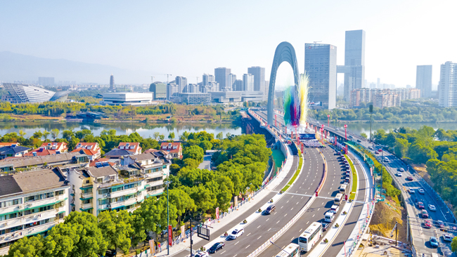 重建后的金婺大橋全長696米,主橋總長265米、寬40米,總投資3.3億元。大橋采用獨塔斜拉橋的現代設計,主塔為鋼結構拱形塔柱,塔高82.4米,重達2148噸,呈倒水滴狀,成為金華城區又一處新的地標式建筑。(吳振榮、周垚、胡肖飛)