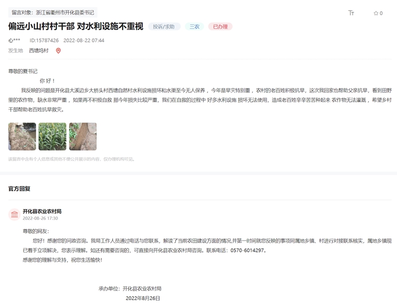 解群眾之難,化群眾之急。接到留言求助后,開化縣農業農村局相關工作人員通過電話與鄭先生取得了聯系,解讀了當前農田建設方面的情況,并第一時間就其反映的事項同屬地鄉鎮、村進行對接聯系核實。在留言回復中,開化縣農業農村局相關工作人員表示,目前,屬地鄉鎮已著手立項解決。