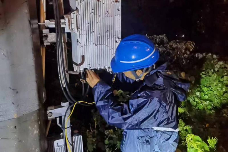 寧波象山分公司的網絡保障人員在風雨中進行設備安裝。浙江移動供圖