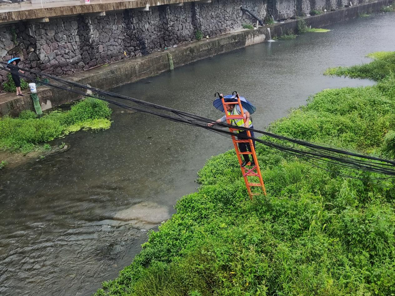 浙江移動臺州分公司網絡維護人員在三門珠游溪處理跨河光纜垂掛隱患。浙江移動供圖