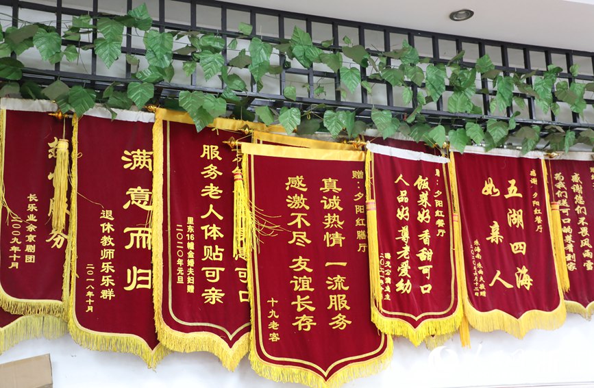 夕陽紅膳廳內,食客們贈送的錦旗掛滿了一整面墻。人民網 方彭依夢攝