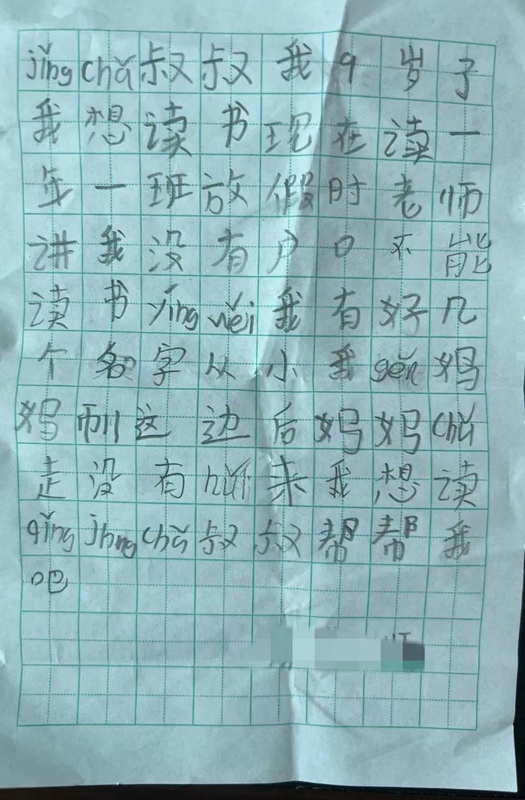 “7月21日下午,在派出所大廳里,孩子一看到我,便從褲兜里掏出來了一張小紙條。紙條是小朋友自己寫的,最后那句話‘我想讀書,請警察叔叔幫幫我吧’,這句話讓我感觸特別深?!贝箬湘偱沙鏊L張時裔說。