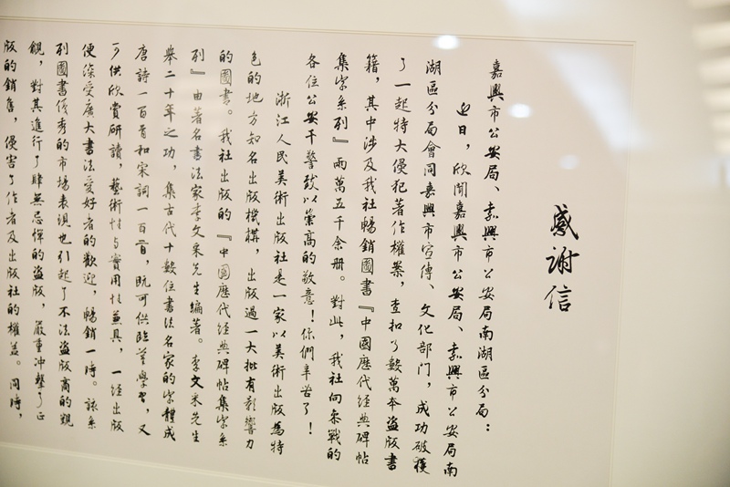 浙江人民美術出版社給嘉興市公安局南湖區分局送去感謝信。吳宇哲攝