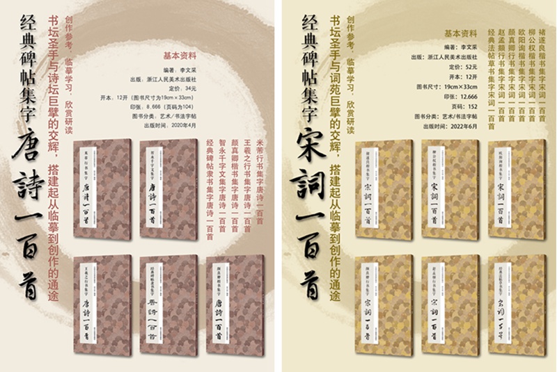 “中國歷代經典碑帖集字系列”是由著名書法家李文采舉二十年之功,集王羲之、顏真卿等古代書法名家的字體編著而成,由浙江人民美術出版社出版成一系列廣為暢銷的《集字唐詩一百首》和《集字宋詞一百首》字帖。