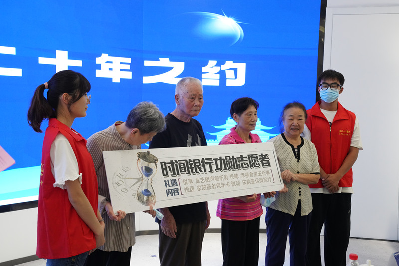轉眼間,“時間銀行”二十年之約如約而至?;顒蝇F場,二十年前湖濱街道第一批“時間銀行”志愿者孫新寶兌換了“時間幣”。
