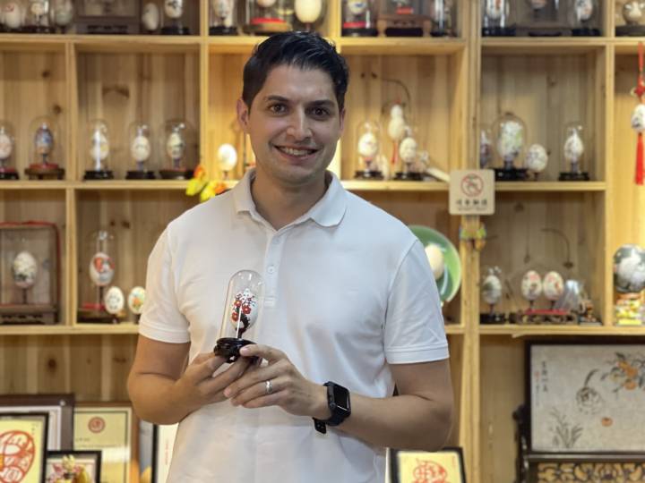 為了讓外國友人更加直觀地了解平陽蛋畫,蛋畫非遺傳承人葉立輝一邊現場制作,一邊講解蛋畫的發展歷史和工藝技巧。在葉立輝的指導下,外國友人們也拿起工具,親自體驗蛋畫的繪制過程,小心翼翼地在脆弱的蛋殼上畫下梅花圖案?!斑@次體驗真的很有趣,我要把這個蛋畫帶回去送給我9個月大的兒子?!眮碜悦绹腄ouglas拿著自己的作品說。
