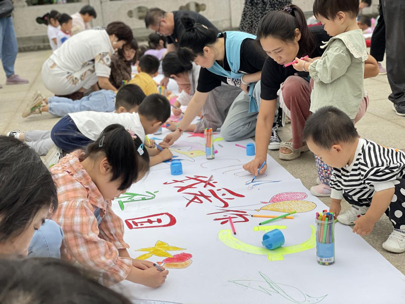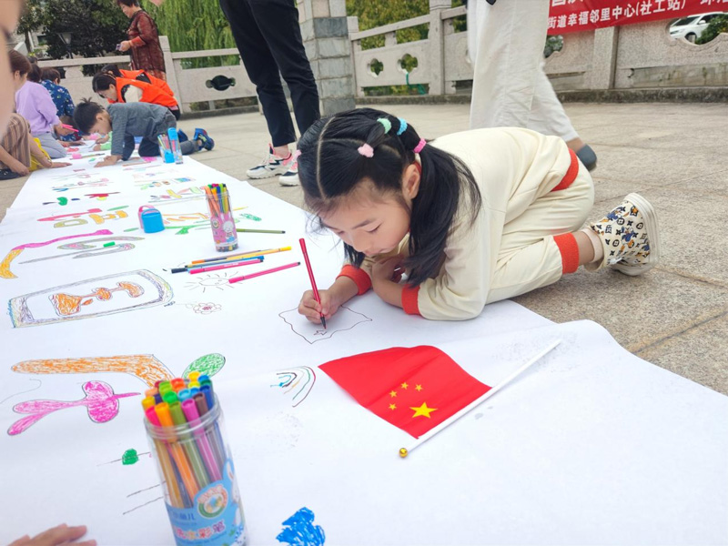 30分鐘時間里,白色的長卷被社區居民、孩子們涂畫得色彩繽紛,將作為社區慶國慶系列活動作品展示出來。