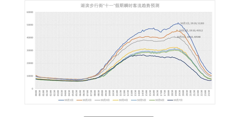 據悉,湖濱步行街假期前三日的客流量最為集中,10月1日即達到假期內天級客流的峰值(26.51萬人次);對瞬時客流的預判則是假期前三日,日瞬時客流峰值將出現在19時左右,假期瞬時客流峰值出現在10月1日,將超過5萬人;次峰值出現在10月2日,預計超過4.5萬人,需要提前做好準備以應對人群聚集與疏散。