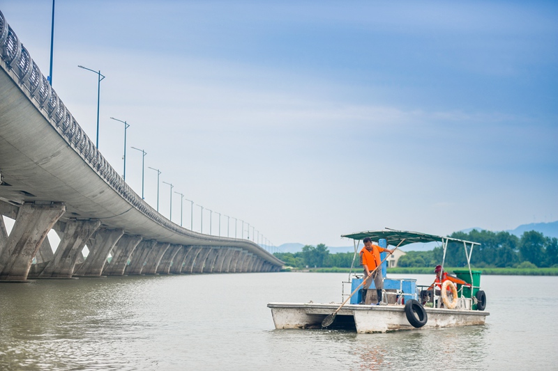 “太湖護水隊”每天對太湖湖面的水葫蘆、藍藻等進行清理。湖州市長興縣太湖街道供圖