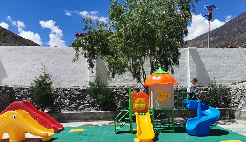 如今,走進扎葉村幼兒園,教室里擺放著新的桌椅,墻上貼滿了美麗的圖案,教室外面搭建了可愛的游樂設施,豐富了小朋友們的幼兒園生活,傳遞了來自浙江杭州的濃濃愛意。