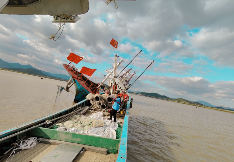 劉振國所在的作業船只緩慢靠近事故漁船,開展救援工作。浙江省水利河口研究院供圖