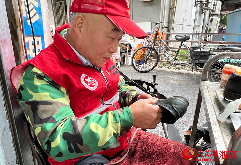 郭新寶幫老街坊修理運動鞋。上城區委宣傳部供圖