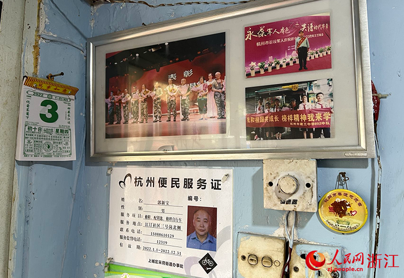 墻上的“杭州便民服務證”和獲獎照片。人民網 艾宇韜攝