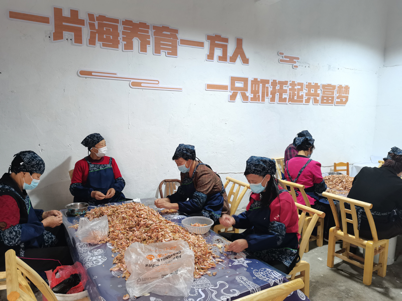 近日,在溫州洞頭區北岙街道東沙村,婦女們圍聚在一起正有條不紊地打包剛精曬好的蝦干。不遠處的“嘿!蝦工坊”內,幾十名婦女正按照規格大小熟練地篩撿、剝凈蝦干。