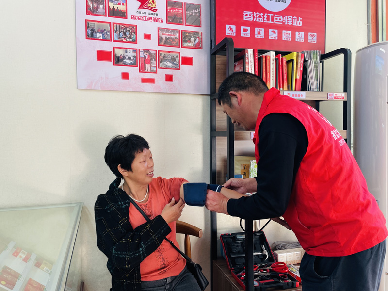 群眾在“香溢紅色驛站”測量血壓。武義縣煙草專賣局供圖