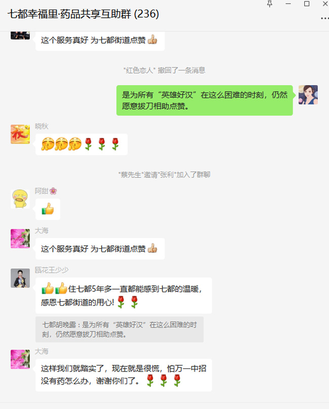 “起初我們也擔心群里求藥的多、愿意贈藥的少,但發現大家還是比較熱心的,目前市面上比較難買的藥也有居民愿意提供?!焙砺墩f。