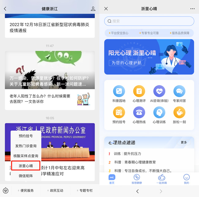為緩解群眾“幻陽”“陽”了之后對未知情況的焦慮,浙江省衛生健康委利用互聯網醫院平臺開通了新冠通道,提供便捷的在線咨詢和復診續方,此外還發布了社會心理服務平臺“浙里心晴”,開展心理科普、AI心理咨詢、心理測評、心理熱線等心理健康服務。