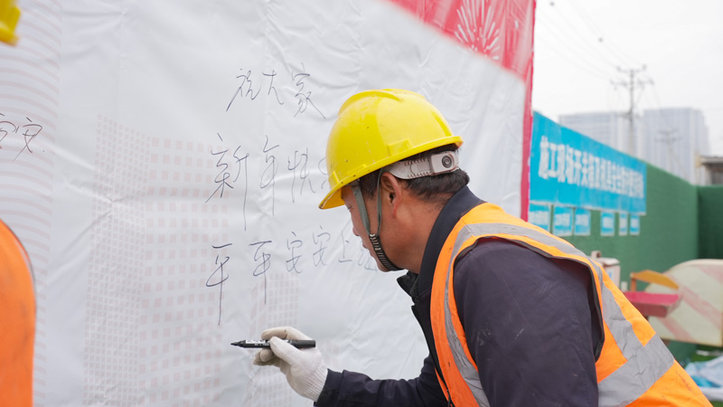 “祝大家新年快樂,平平安安上班!”這是項目部鋼筋工李三樹寫下的愿望?!榜R上春暖花開,日子肯定一天比一天好!”他跟工友互相勉勵著。
