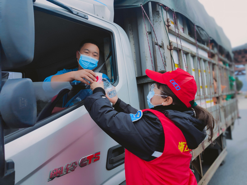 志愿者為司機送上熱水。滬杭甬公司供圖